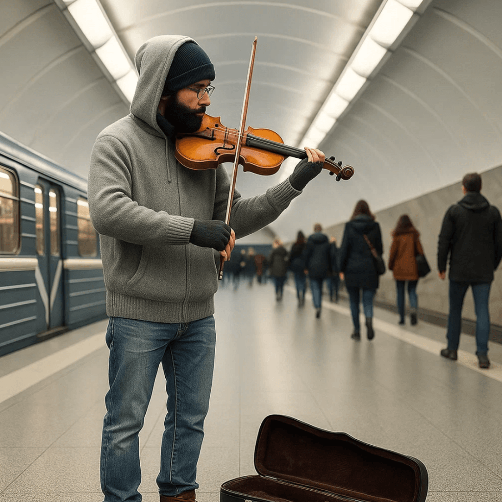 En medio del bullicio cotidiano, junto a una papelera y bajo luces fluorescentes, un hombre con vaqueros, gorra y una sudadera arrugada abre un estuche de violín.